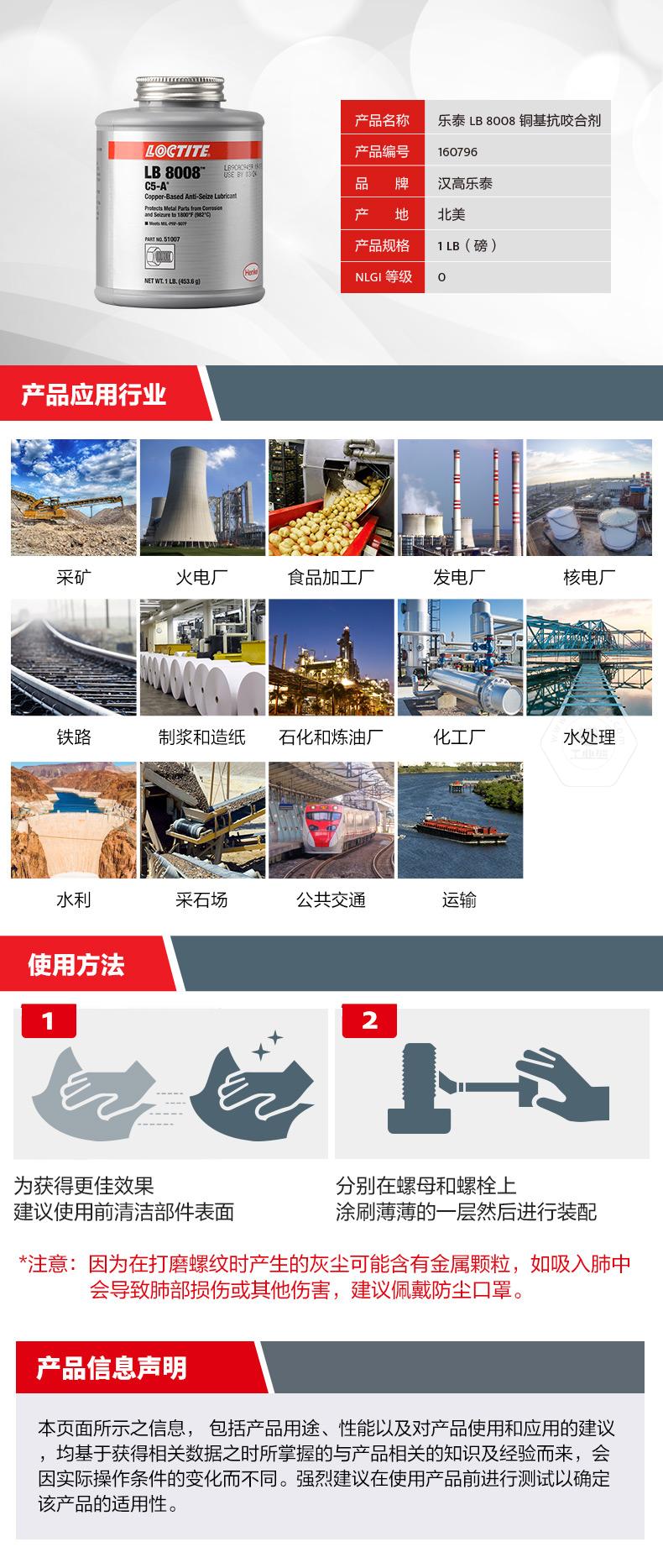 樂泰LB8008銅基抗咬合劑是一款通用型耐高溫抗咬合劑。樂泰LB8008銅基抗咬合劑耐溫可達(dá)982℃,具備防銹蝕、防卡死、NLGI等級為0等特點(diǎn)。樂泰LB8008銅基抗咬合劑適用于高負(fù)載和極端環(huán)境,可幫助避免咬合破損、延長設(shè)備壽命、減少意外停機(jī)。樂泰LB8008銅基抗咬合劑自帶頂刷并可自動攪拌,操作更簡便,適用于采礦、發(fā)電、石化、鐵路、水處理等行業(yè)。