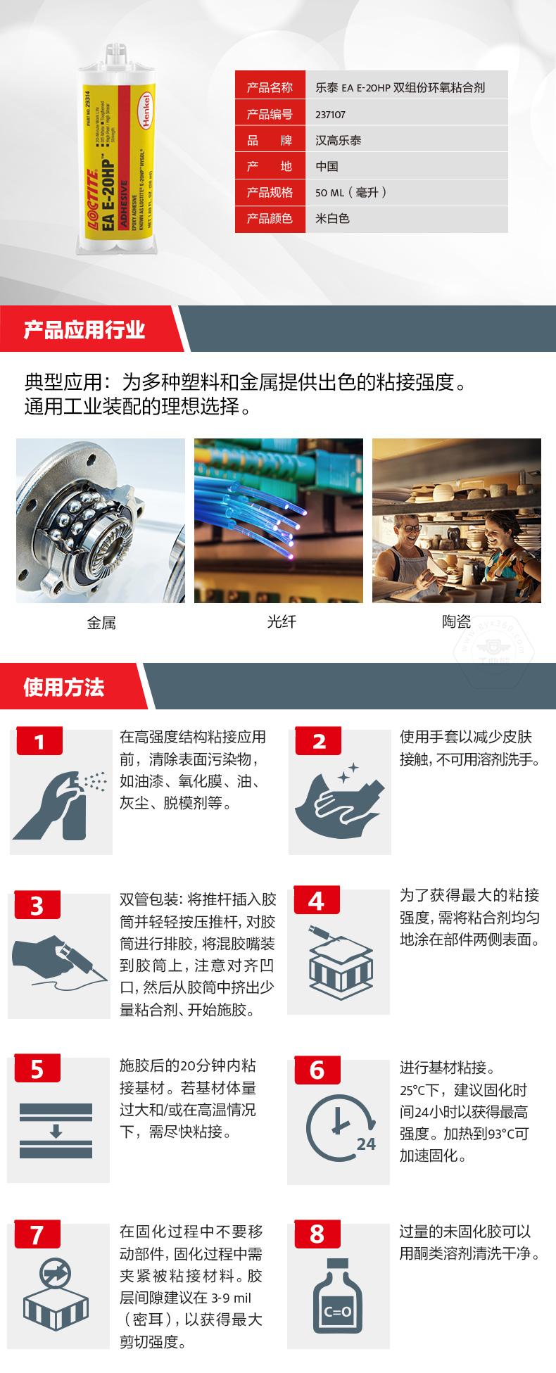 樂泰EA E-20HP雙組份環(huán)氧粘合劑是一款雙組份、通用型工業(yè)級(jí)環(huán)氧樹脂膠粘劑。樂泰EA E-20HP雙組份環(huán)氧粘合劑具備高抗剝離性、高剪切強(qiáng)度、耐化學(xué)性和增強(qiáng)韌性,可為多種塑料和金屬提供出色粘接強(qiáng)度。樂泰EA E-20HP雙組份環(huán)氧粘合劑適用于金屬、光纖、陶瓷等材料,是通用工業(yè)裝配的理想選擇。